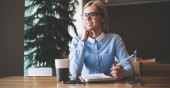 Portret młodej kobiety w okulary planowanie projektu i analizowanie informacji spędzać czas w kawiarni inteior, kobiet student Dokonywanie badań dla zajęć uczenia się, patrząc na kamery w kampusie