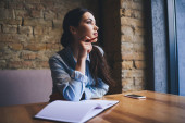 Zdjęcie "Zamyślony kobietę w okularach, zastanawiając się nad biznes plan siedzi z notatnika w café wnętrze, myślących kobiet student marzyć podczas nauki informacji i odrabiania lekcji w kampusie uczelni" może być wykorzystywane do celów osobistych i komercyjnych zgodnie z warunkami zakupionej licencji Royalty-free. Obraz jest dostępny do pobrania w jakości wysokiej rozdzielczości do 5760x3840.