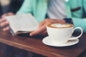 Relaksując się przy kawie w kawiarni ręce kobiety. Koncepcja życia kobiet.