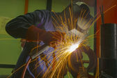 Robotnik w fabryce, spawanie, przemysłowy robotnik w fabryce spawania zbliżenie