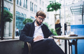 Portret pewnie biznesmen kaukaski w garnitur, siedząc przy stoliku w kawiarni city podczas pracy Przerwa kawowa, przystojny mężczyzna dyrektora wykonawczego podejmowania plan pisanie notatki w Notatniku w centrum na zewnątrz