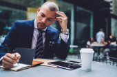 Zdjęcie "Portret pewnie biznesmen kaukaski w garnitur, siedząc przy stoliku w kawiarni city podczas pracy Przerwa kawowa, przystojny mężczyzna dyrektora wykonawczego podejmowania plan pisanie notatki w Notatniku w centrum na zewnątrz" może być wykorzystywane do celów osobistych i komercyjnych zgodnie z warunkami zakupionej licencji Royalty-free. Obraz jest dostępny do pobrania w jakości wysokiej rozdzielczości do 5760x3840.