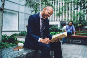 Portret biznesmen wesoły zadowolony z firmy dochodów budżetu analizując podczas przerwy na kawę, dostatniej właściciel firmy Dokonywanie plan startowy robi twórcze rozwiązanie siedzi przy stole na świeżym powietrzu
