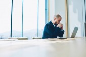 Przemyślane dyrektor finansowy, robiąc notatki wartości budżetu, siedząc przy stole na świeżym powietrzu, na miejskich ustawienie, zamyślony biznesmen zdziwiony piśmie w Notatniku, analizowanie informacji w trakcie przerwa na kawę w mieście