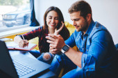 Zdjęcie "Portret zamyślony mężczyzna studenckich na projekt we współpracy z koleżanka, wskazując na informacje na stronie internetowej, przyjaciele, Dokonywanie zakupów online za pomocą komputera przenośnego w café wnętrze" może być wykorzystywane do celów osobistych i komercyjnych zgodnie z warunkami zakupionej licencji Royalty-free. Obraz jest dostępny do pobrania w jakości wysokiej rozdzielczości do 5760x3840.