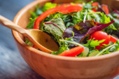 Widok z góry z sałatką ze świeżych warzyw na podłoże drewniane.