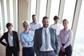 portret starszego biznesmena jako lidera w nowoczesnym jasnym wnętrzu biurowym, grupa młodych ludzi w tle jako zespół