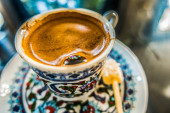 Zdjęcie "Turecki Gorąca kawa w tradycyjnych Puchar painted widok z góry na stole w kawiarni" może być wykorzystywane do celów osobistych i komercyjnych zgodnie z warunkami zakupionej licencji Royalty-free. Obraz jest dostępny do pobrania w jakości wysokiej rozdzielczości do 5760x3840.
