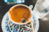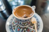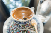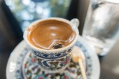 Turecki Gorąca kawa w tradycyjnych Puchar painted widok z góry na stole w kawiarni