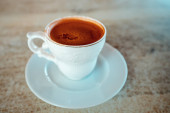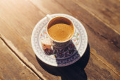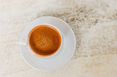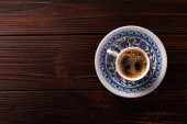 Turecki Gorąca kawa w tradycyjnych Puchar painted widok z góry na stole w kawiarni