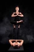 Acroyoga. Młoda para razem praktykują acro jogi maty w studio. Para Joga. Joga partnera. Czarno-białe zdjęcie.