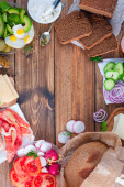 Składniki do przygotowania tradycyjne duńskie Kanapki zwane Smorrebrod na chleb żytni z warzyw, czerwona ryba, krewetki, jaja, śledzia i zieleni. Widok z góry, poziome, kopiować miejsca.