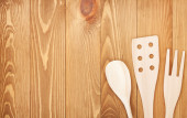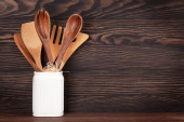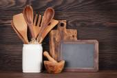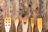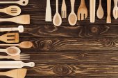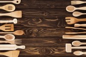 Różnymi przyborami kuchennymi na stole w kuchni drewniane. Widok z góry z miejsca