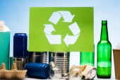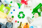 Widok z góry różnego rodzaju śmieci z kosza znak na białym