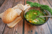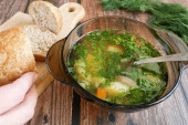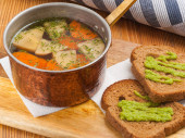 Zupa z mięsem, ziemniaki i marchew. Zupa z wołowiny w misce biały,