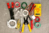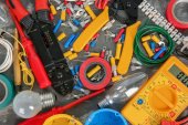 Mieszkanie świeckich skład z narzędzi elektrycznych na szarym tle