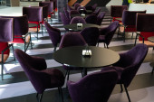 czerwony i beżowy fotele są obok restauracji tabel, które są pokryte długo bordowy obrusy