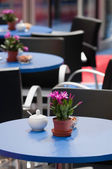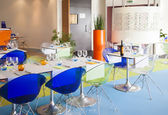 czerwony i beżowy fotele są obok restauracji tabel, które są pokryte długo bordowy obrusy