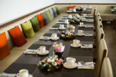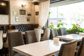 Zdjęcie "czerwony i beżowy fotele są obok restauracji tabel, które są pokryte długo bordowy obrusy" może być wykorzystywane do celów osobistych i komercyjnych zgodnie z warunkami zakupionej licencji Royalty-free. Obraz jest dostępny do pobrania w jakości wysokiej rozdzielczości do 5760x3840.