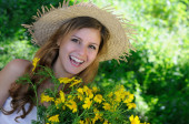 portret młodej kobiety uśmiechający się ze słonecznikiem