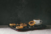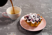 Ciasto z serem i Blackberry, Kawa z mlekiem. Pyszne śniadanie.