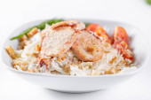 Sałatka Cezar z Royal krewetki. Składa się z Sałata lodowa liść i grzankami ubrany z parmezanem. Białe tło światło