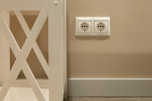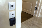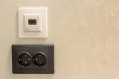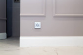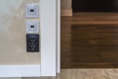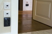 Zdjęcie "Nowoczesne wnętrze z ciepłej podłogi kontroler panele ścienne, parkiety i białe drzwi" może być wykorzystywane do celów osobistych i komercyjnych zgodnie z warunkami zakupionej licencji Royalty-free. Obraz jest dostępny do pobrania w jakości wysokiej rozdzielczości do 5760x3840.