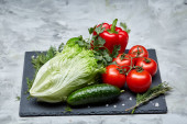 Zdjęcie "Odświeżanie szczegół martwa bukiet świeżych warzyw i ziół na niebieskim tle, widok z góry, Selektywny fokus." może być wykorzystywane do celów osobistych i komercyjnych zgodnie z warunkami zakupionej licencji Royalty-free. Obraz jest dostępny do pobrania w jakości wysokiej rozdzielczości do 5760x3840.