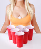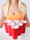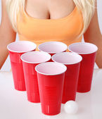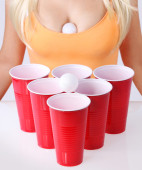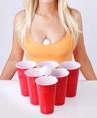 blondynka młoda kobieta pije piwo z zielone butelki na białym tle