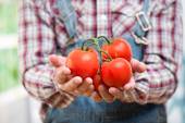 Starszy człowiek gospodarstwa domu uprawiane pomidory z bliska
