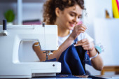 piękne seamstess siedzi przed maszyna do szycia rozmycie ruchu w pracy