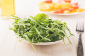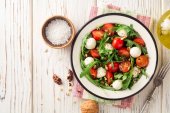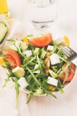 Sałatka w misce na drewnianym stole.