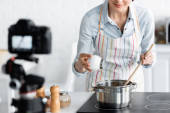 przycięte zdjęcie kobiety zakładanie pan kuchenka elektryczna w kuchni