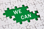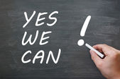 Tak możemy! Uwaga: jest napisane na białej naklejce, który wisi z clothespin na linie na tle karton brązowy