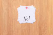 Nie! Uwaga: jest napisane na białej naklejce, który wisi z clothespin na linie na tle karton brązowy
