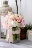 Bukiet czerwonych róż na wesele wydarzenie. Bukiet czerwonych róż w misce wewnątrz kwiaciarnię.
