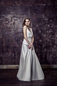 atrakcyjna kobieta w czarny długi wieczór sukienka, pozowanie na kroki schody granitowe