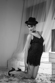 atrakcyjna kobieta siedzi na kroki schody granitowe