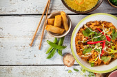 Azjatki, boczek i finocchetto curry z ryżem i świeże warzywa
