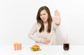 Ciężkie kobieta pokazuje gest przystanek przy stole z burger frytki cola w szklanej butelce na białym tle. Prawidłowe odżywianie lub klasyczny amerykański fast food. Reklama obszar z miejsca kopii.