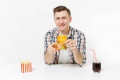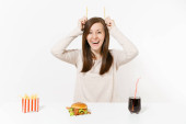 Zabawa, szczęśliwą kobietą, przy stole z kilku części, ziemniaki, frytki, burger, cola w szklanej butelce na białym tle. Prawidłowe odżywianie lub klasyczny amerykański fast food. Obszar z miejsca kopii.