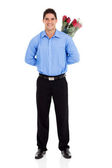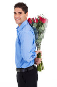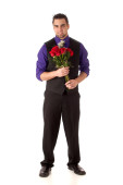 młody człowiek szczęśliwy, dając kilka róż na białym tle