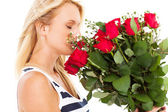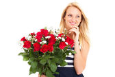 Szczęśliwa młoda kobieta przytulanie kilka róż na białym tle