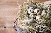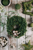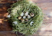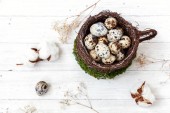 Wiosna Wielkanoc wieniec z jaj przepiórczych, ozdoba we wnętrzu i na głowie. Kompozycje z mchu i zieleni na podłoże drewniane