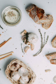 Wiosna Wielkanoc wieniec z jaj przepiórczych, ozdoba we wnętrzu i na głowie. Kompozycje z mchu i zieleni na podłoże drewniane