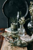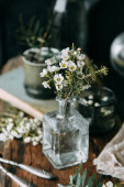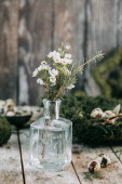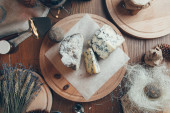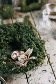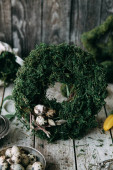 Wiosna Wielkanoc wieniec z jaj przepiórczych, ozdoba we wnętrzu i na głowie. Kompozycje z mchu i zieleni na podłoże drewniane