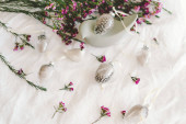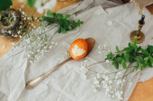 Wiosna Wielkanoc wieniec z jaj przepiórczych, ozdoba we wnętrzu i na głowie. Kompozycje z mchu i zieleni na podłoże drewniane