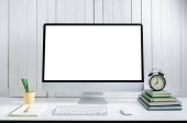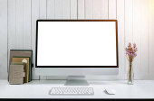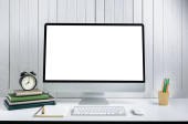Zdjęcie "miejscu pracy tła z pusty biały ekran nowoczesne pulpit komp" może być wykorzystywane do celów osobistych i komercyjnych zgodnie z warunkami zakupionej licencji Royalty-free. Obraz jest dostępny do pobrania w jakości wysokiej rozdzielczości do 5760x3840.