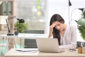 Zdjęcie "Młoda kobieta cierpiąca na ból głowy w urzędzie" może być wykorzystywane do celów osobistych i komercyjnych zgodnie z warunkami zakupionej licencji Royalty-free. Obraz jest dostępny do pobrania w jakości wysokiej rozdzielczości do 5760x3840.
