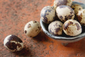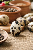 Jaja przepiórcze na świąteczny stół, na drewnianym stole z dekoracje i tkaniny. Świeże zioła i sól. Wielkanoc ozdoby